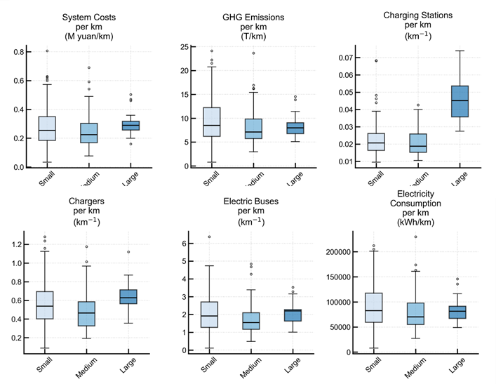 The burden of bus electrification varies markedly across Chinese cities, with the annualized total cost ranging from 0.01% to 1.2% of city-level GDP and the annual electricity demand accounting for 0.6% to 17.83% of industrial electricity consumption. To analyse electrification performance across Chinese cities, we classified cities into three categories based on bus network length: large, medium and small. Differences in network scale and topology across these categories further shape infrastructure deployment and cost–benefit performance.